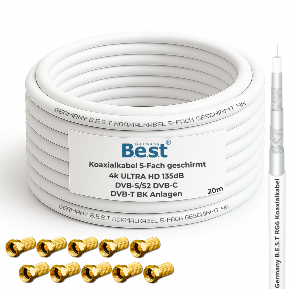 Koaxialkabel 20m SAT-Kabel | 4K Ultra HD | Class A+ | DVB-S/S2 DVB-C DVB-T BK Anlagen | 5Fach Geschirmt | 135dB | Antennenkabel | Koaxkabel | 10x F-Stecker