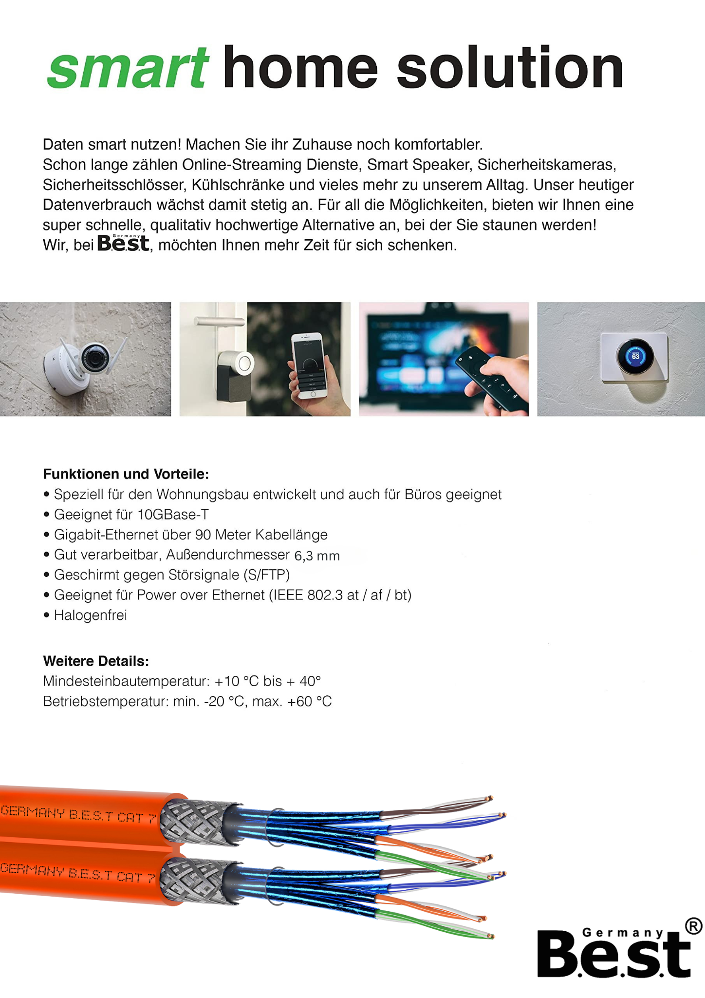 Hohe Frequenz bis 1000 MHz (Klasse FA, Cat 7a) – Beste Signalqualität, minimale Dämpfung und maximale Geschwindigkeit durch hochwertige AWG25-Kupferleiter. Optimal für anspruchsvolle Smart-Home- und Business-Installationen.