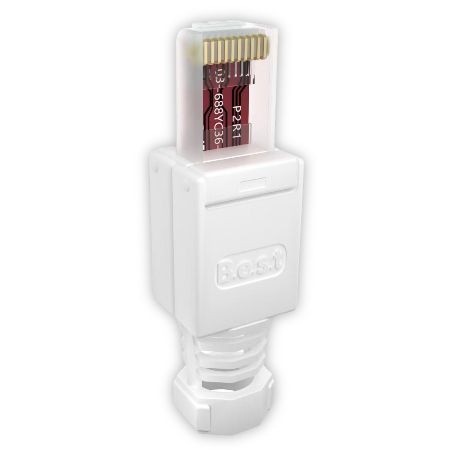 - Farbig markierte Kabelkontakte im Steckergehäuse ermöglichen eine mühelose Verdrahtung der LAN-Kabeladern. Nach dem Einstecken der Adern wird der Stecker einfach zusammengedrückt, und das Ethernet-Kabel ist betriebsbereit.